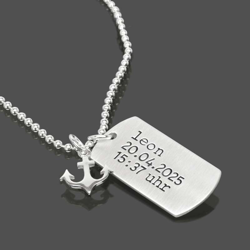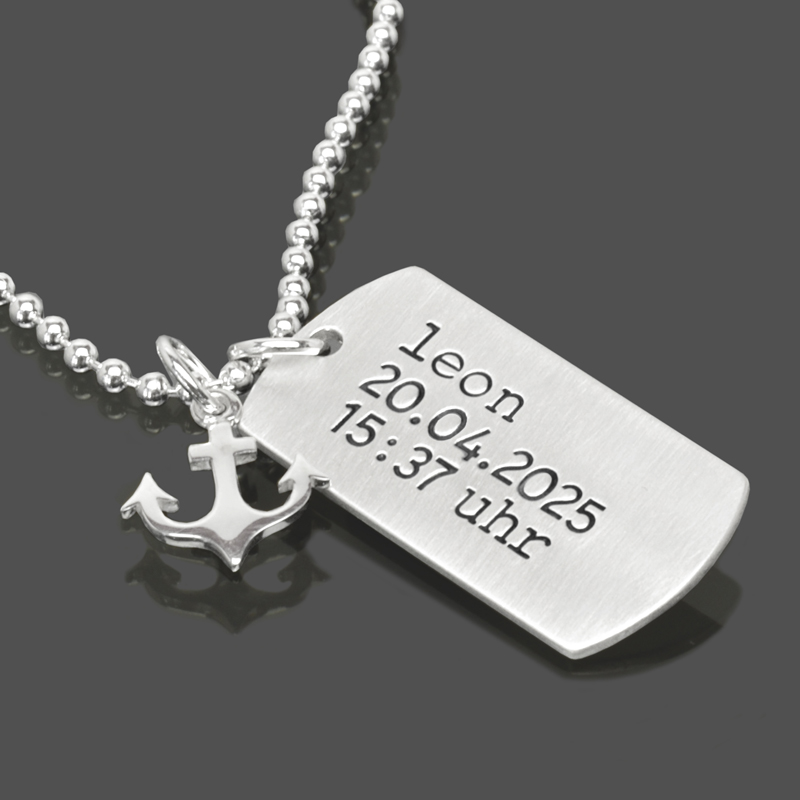 Diese stylische Kette für Herren aus 925 Sterling Silber ist ein ganz besonderes Geschenk für frisch gebackene Väter. Der DogTag-Anhänger kann mit den Daten des Kindes (Name, Geburtsdatum, Uhrzeit der Geburt) personalisiert werden und wird begleitet von einem silbernen Anker. Der individualisierbare Silberanhänger wird an einer hochwertigen Silberkette geliefert.